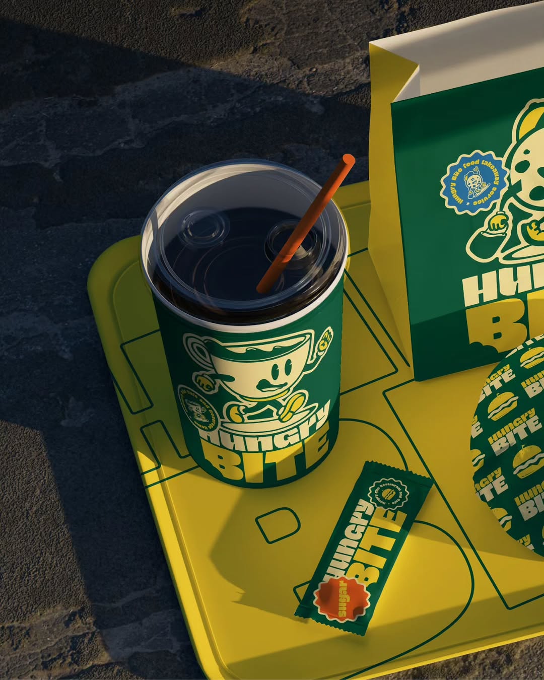 The final outcome is a bold and engaging brand identity that successfully reflects the energy and appeal of Hungry Bite. With a visually striking design system and a clear, consistent aesthetic, the brand stands out effectively in the fast-food segment, creating a strong and lasting impression across all touchpoints.